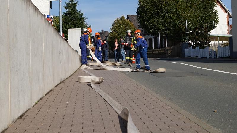 Die knapp 50 Jugendlichen der Gemeinde wurden zu einem Brand in den völlig verrauchten Bereich der Umkleidekabinen im Bürgerhauses gerufen. Am Einsatzort angekommen, begannen alle Jugendabteilung mit der Arbeit, Schläuche ausrollen, Hydranten setzen und den "Brand" im Gebäude unter Kontrolle bringen stand auf dem Programm.