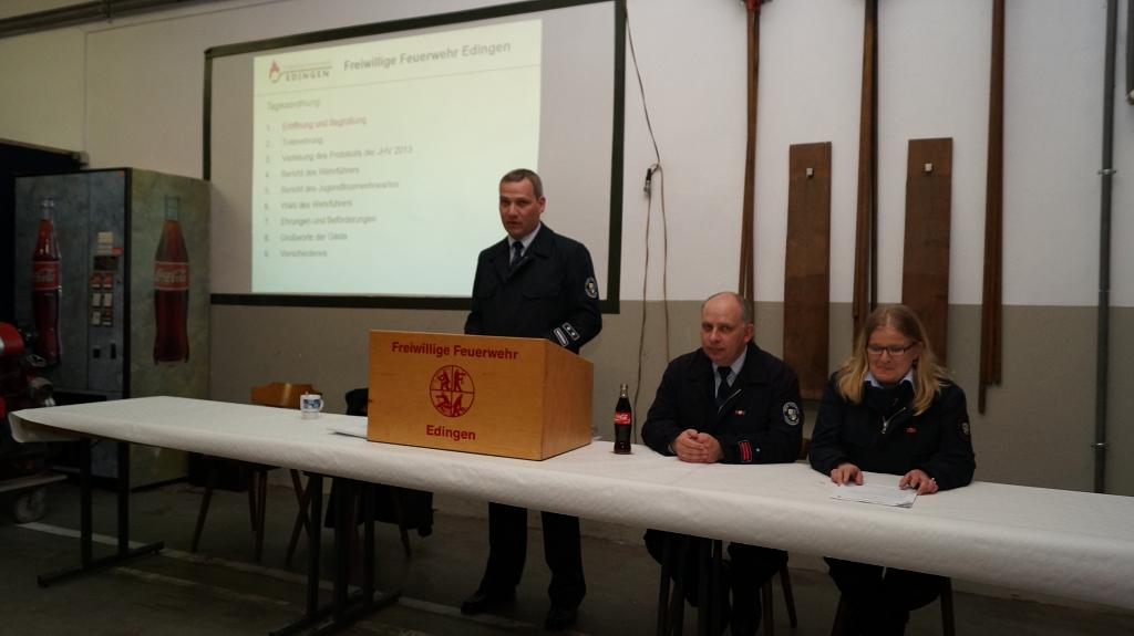 Bei der diesjähringen Jahreshauptversammlung am 14. März 2014 versammelten sich die Mitglieder der Einsatz- und Altersabteilung, sowie die Mitglieder des Edinger Feuerwehrvereines im Edinger Gerätehaus. Neben Gästen aus der kommunalen Politik konnte Wehrführer Jens Petri auch eine Delegation aus Fleisbach und aus der Partnerwehr Edingen-Neckarhausen begrüßen. In seinem Jahresbericht konnte Petri eine sehr positive Bilanz zum Zustand seiner Wehr ziehen. Die Feuerwehr Edingen sei personell und technisch sehr gut aufgestellt und kann auch mit größeren Wehren im Umkreis mithalten. Die 29 Einsatzkräfte mussten 2013 18 mal im Gebiet der Gemeinde Sinn ausrücken, darunter einige kleinere Brände und mehrere Brandmeldeanlangen. Außerdem thematisierte er die Tagesalarmsicherheit der Feuerwehr, die in den nächsten Jahren ein immer größeres Thema wird, aber in der Edinger Wehr gesichert ist.