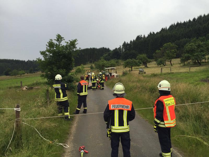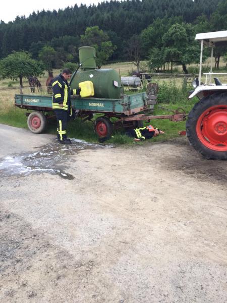 Im praktischen Teil wurde ein Unfall mit einem landwirtschaftlichen Fahrzeug angenommen, welches Pestizide geladen hatte. Dabei wurde der Fahrer von seinem Fahrzeug geschleudert und lag verletzt unter dem Anhänger. Der Gefahrstoff wurde durch den Unfall freigesetzt und lief aus.