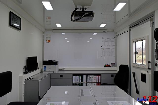 Der Besprechungsraum dient zur Darstellung der Lage an einer Einsatzstelle und zum Durchführen regelmäßiger Besprechungen des Einsatzleiters. Hier können zudem, geschützt vor Witterung oder Lärm an der Einsatzstelle, wichtige Telefonate oder sonstige Gespräche "in Ruhe" geführt werden. Auch hierzu gibt es umfangreiche technische Untersützung: