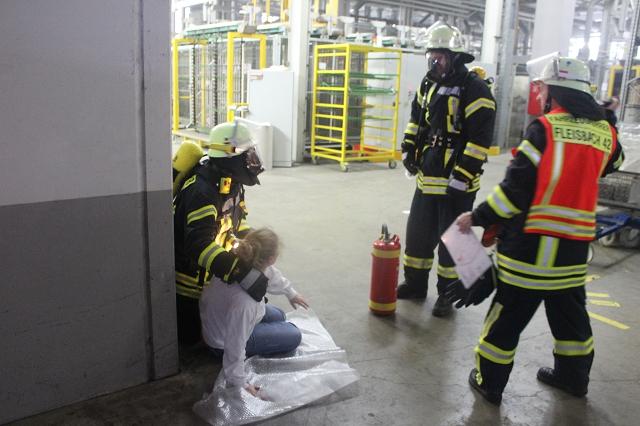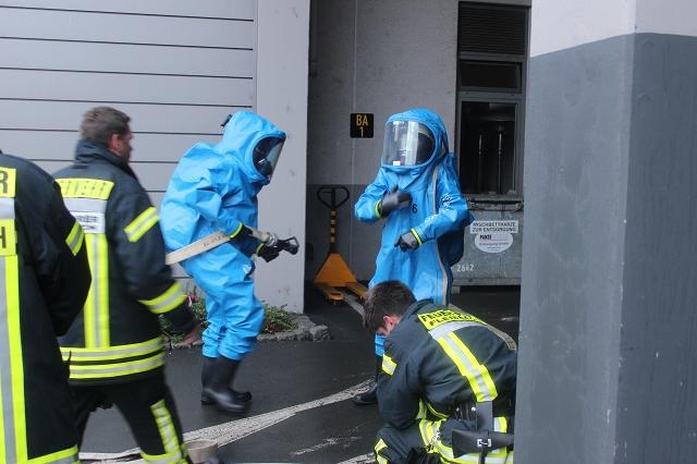 Die geschminkte und realistisch agierende Person wurde von einem Trupp betreut und sofort wurden Maßnahmen für einen Gefahrguteinsatz eingeleitet. Dies beinhaltet die Festlegung eines Gefahrenbereiches (Personen innerhalb des Bereiches dürfen diesen nur nach einer ausgiebigen Dekontamination verlassen), Einrichtung eines Not-Dekontaminationsplatzes (Oberflächliche Reinigung verletzter Personen am Rande des Gefahrenbereiches, damit diese an den Rettungsdienst übergeben werden können), Anlegen von Schutzausrüstung zur Personensuche im inneren des Gebäudes, Aufbau eines dreifach Brandschutzes (Wasser-, Schaum- und Pulverlöschmittel) und die Nachalarmierung von Sonderkräften aus Herborn.