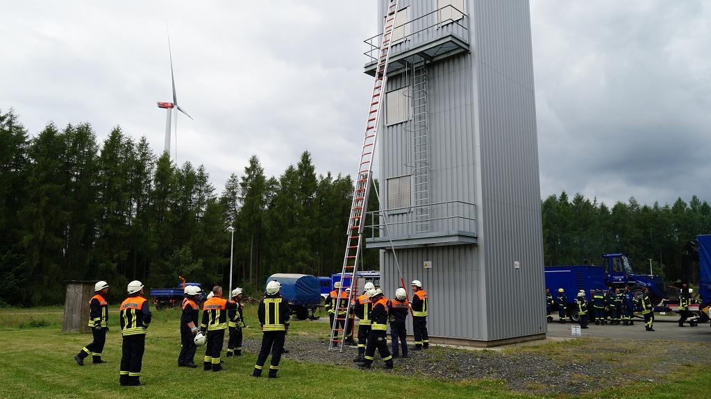 Am Samstagmorgen trafen sich die beiden Einsatzabteilungen zu einem gemeinsamen Übungstag in Frohnhausen. Nachdem sich alle Einsatzkräfte gegen 11 Uhr auf dem Übungsgelände versammelt hatten, erhielten sie von Jens Petri eine kurze theoretische Auffrischung zum Thema "Umgang mit einer Schiebleiter". Da das neue Löschfahrzeug der Gemeinde Sinn eine solche Schiebleiter auf dem Auto verlastet hat, muss der richtige Umgang mit einer solchen Leiter regelmäßig geübt werden. Nachdem die Kameraden die Schiebleiter aufgestellt hatten, durften die interessierten Kameraden die Leiter bis ins 3. OG besteigen, um ein Gefühl für die Leiter zu bekommen.