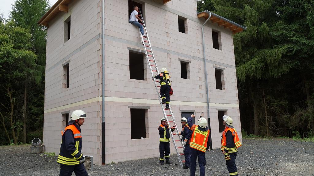 Als nächstes stand Menschenrettung und Vorgehen mit einer Steckleiter auf dem Programm. Hierbei sollten die Kameraden den Umgang mit der 4-teiligen-Steckleiter trainieren und für den Ernstfall verbessern. Dazu mussten die Einsatzkräfte verschiedene Szenarien an einem Übungshaus abarbeiten und verschieden Menschenrettungen durchführen. Zusätzlich zu der Menschenrettung gab es Auffrischungen zum Vorgehen im Innenangriff und zur Wasserentnahme aus offenen Gewässern.
